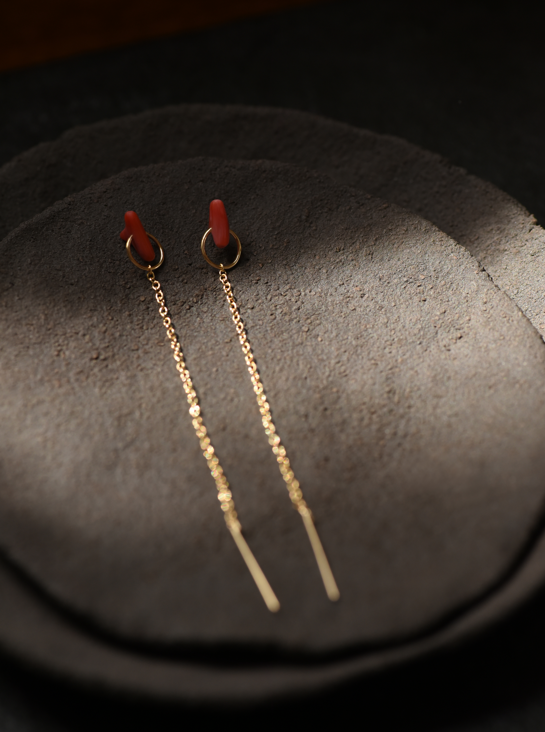 14k gold-filled ear threaders with a Hawaiian red coral accent at the tip.
