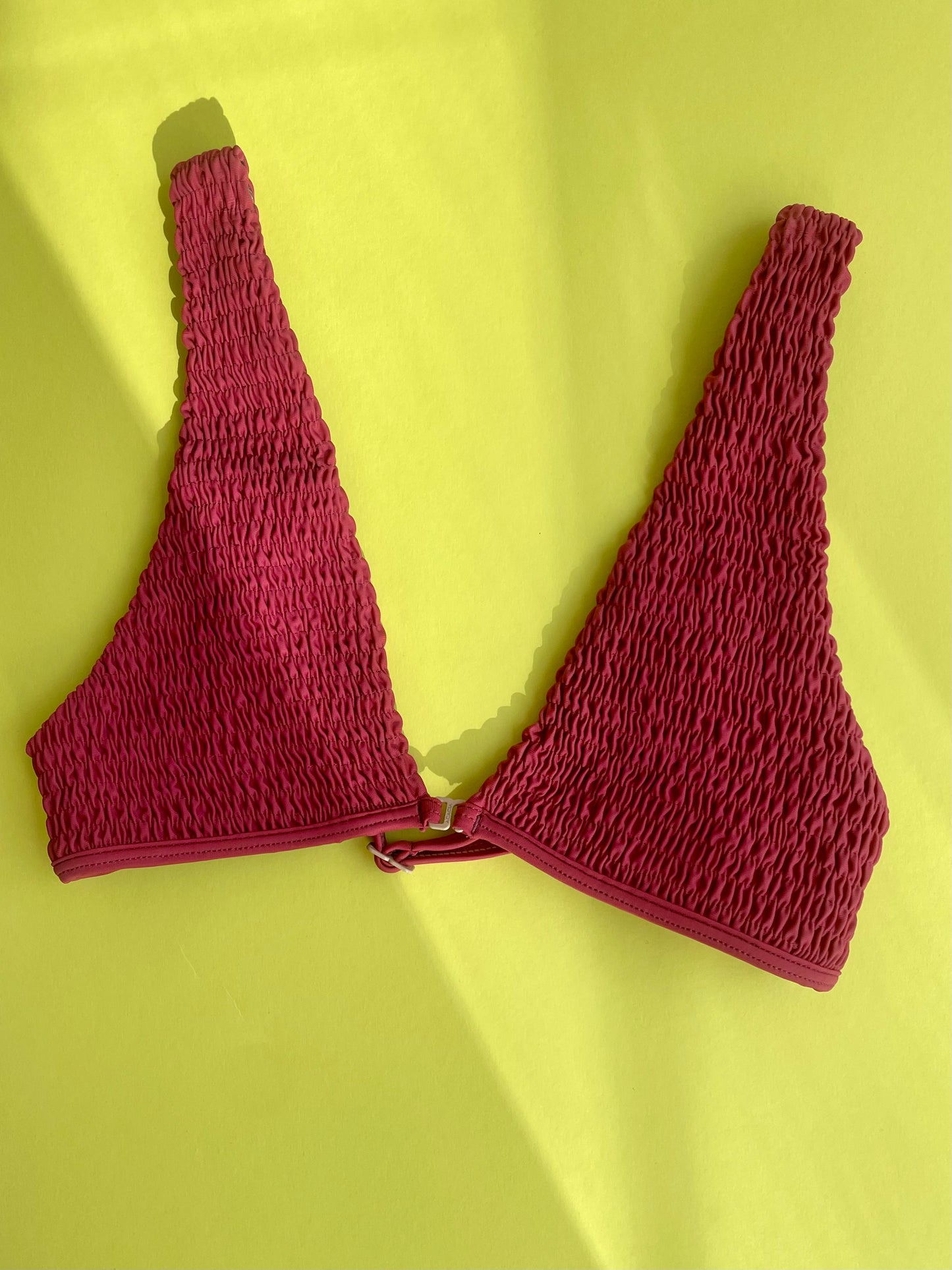ACACIA brought back their flattering smocked fabric, and we're still here for it! Plunging smocked triangle top with adjustable straps. Front clasp for easy wear. The smocking offers a little added lift and support.