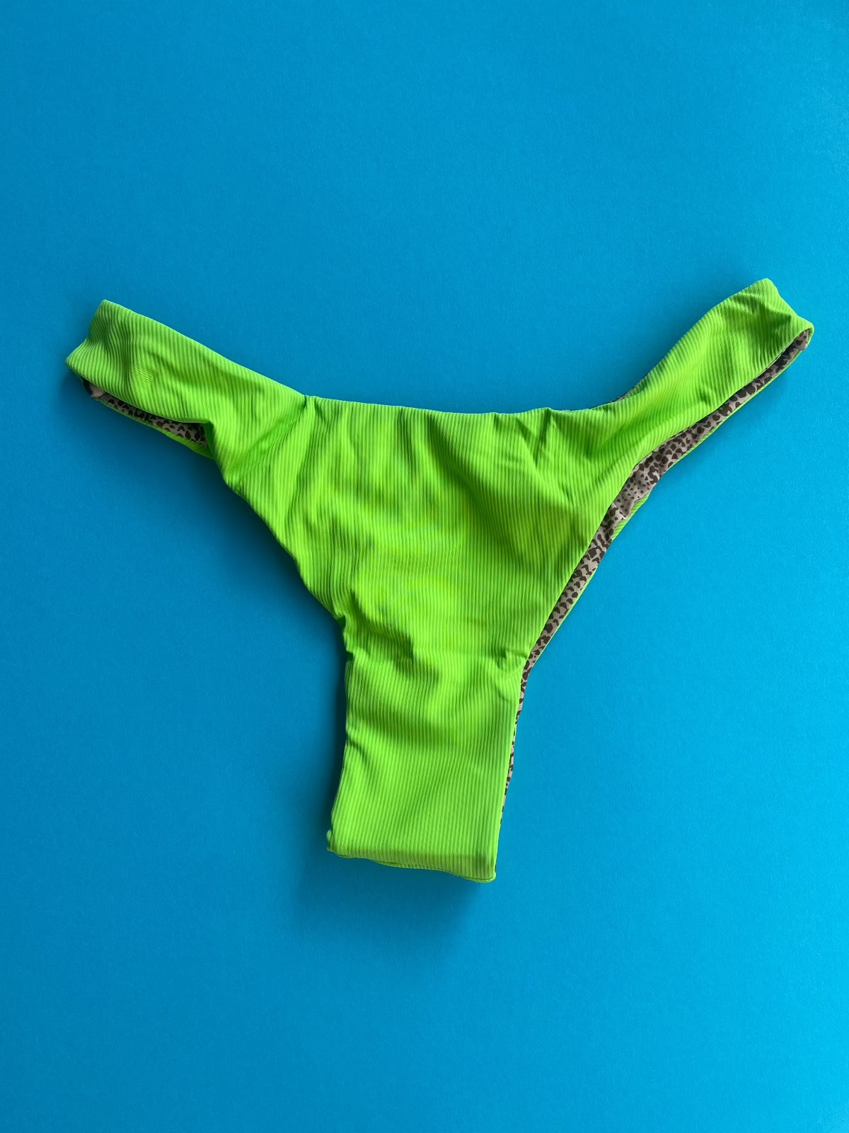 High cut bikini bottom with minimal back coverage perfect for sunbathing. Vibrant ribbed matcha green.