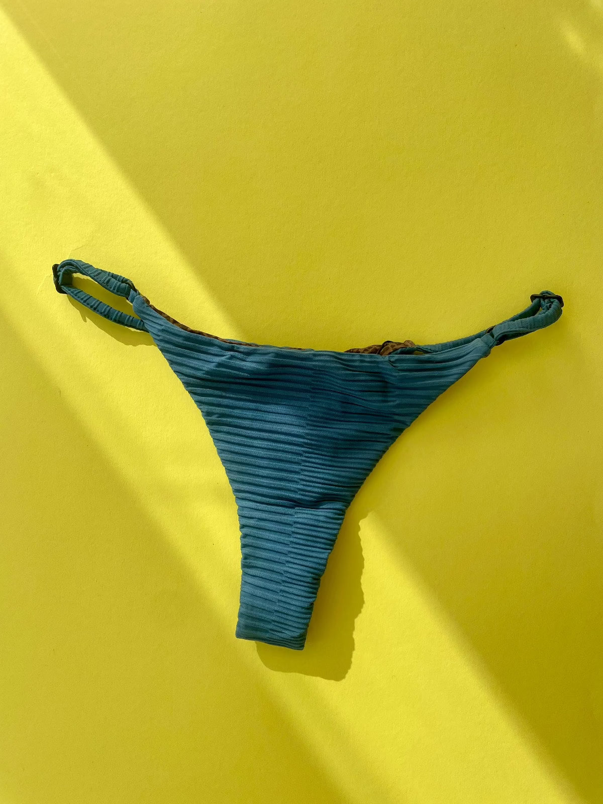 When looking for a teensy bikini, look no further! Adjustable thong bikini bottom assures no digging in on the sides! Horizon blue textured fabric matches back to the Gigi top.