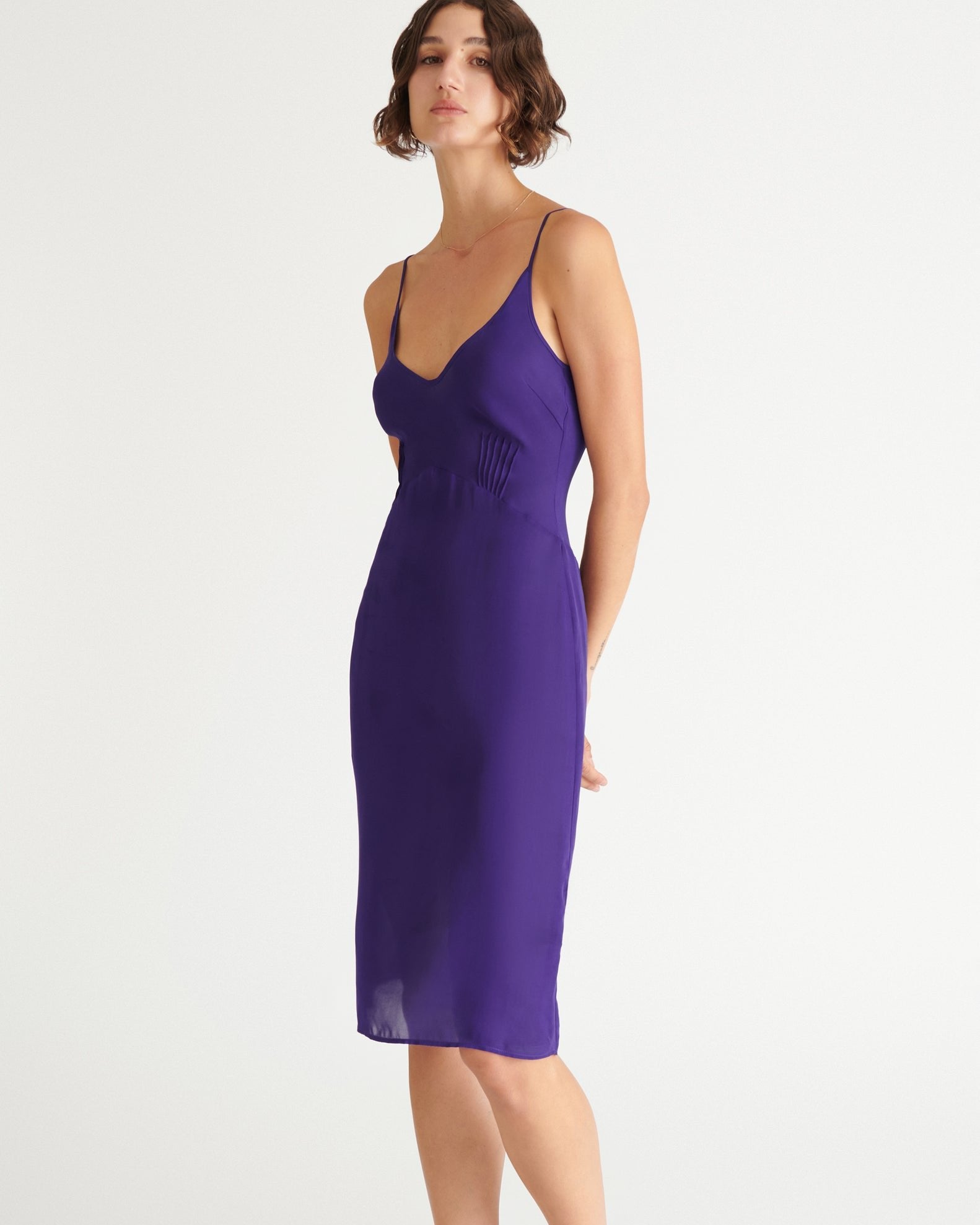 Classic slip in silk georgette with fine pin tucking details that shape the waist and the bust. Plunging neckline shows just the right amount of décolletage.