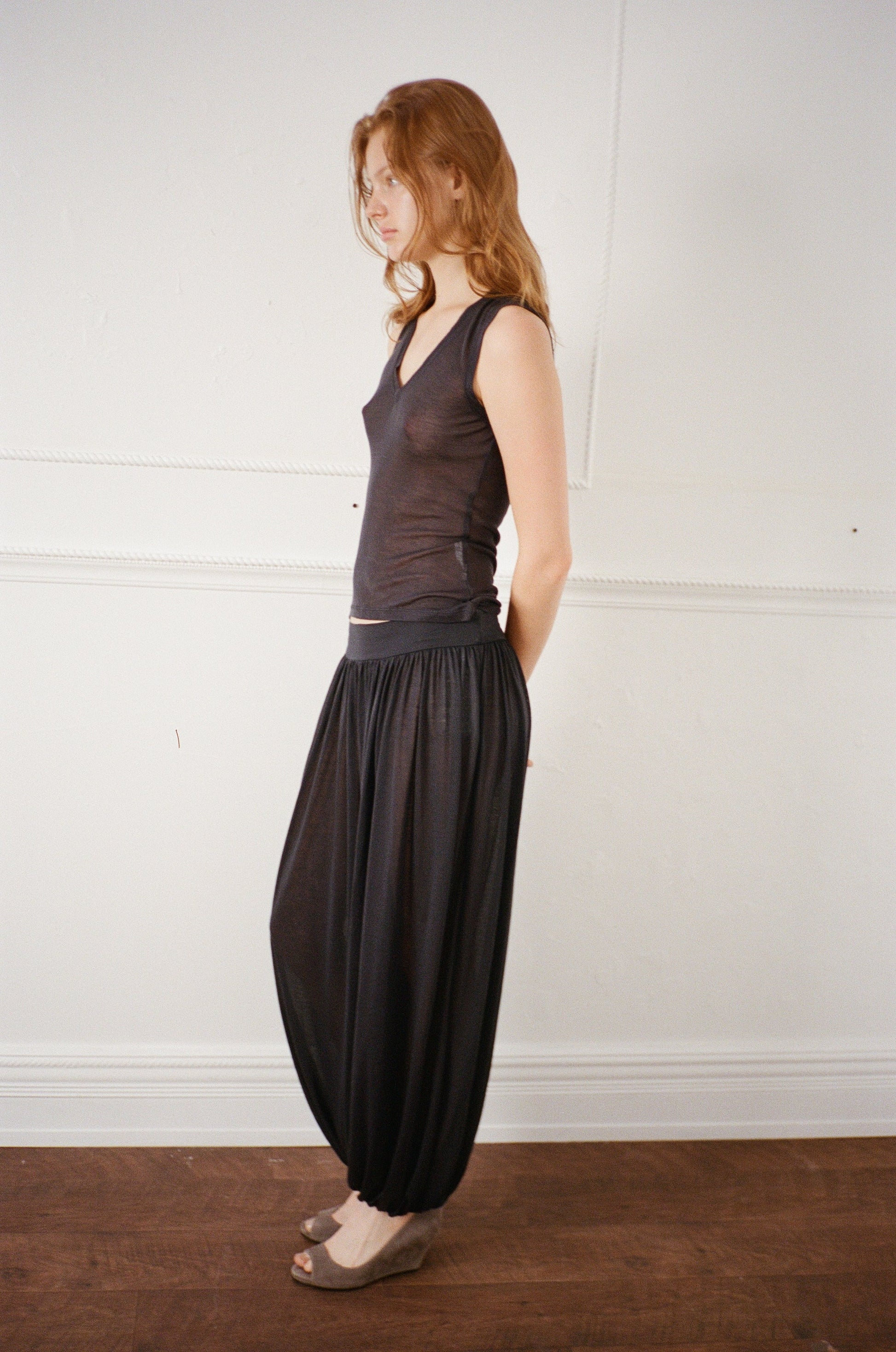 Freaking out over here over these genie pants! Relaxed draped pants in the softest, thinnest fabric with comfy wide waistband, gathered pleating and fitted cuffs.