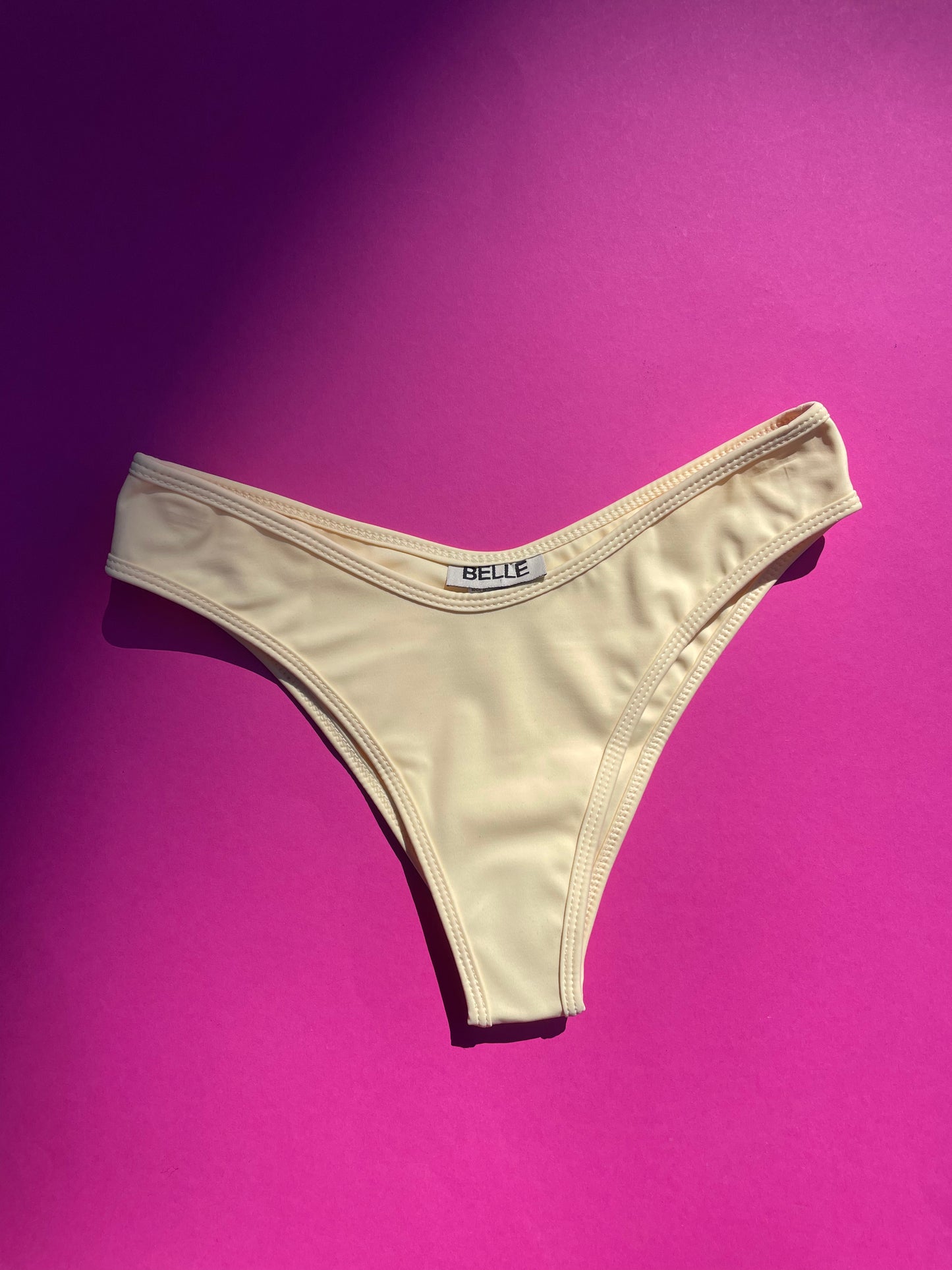 We're swooning over this adorable, feminine halter bikini set in pale banana yellow.  The bottom features a slight dip in the front and back.