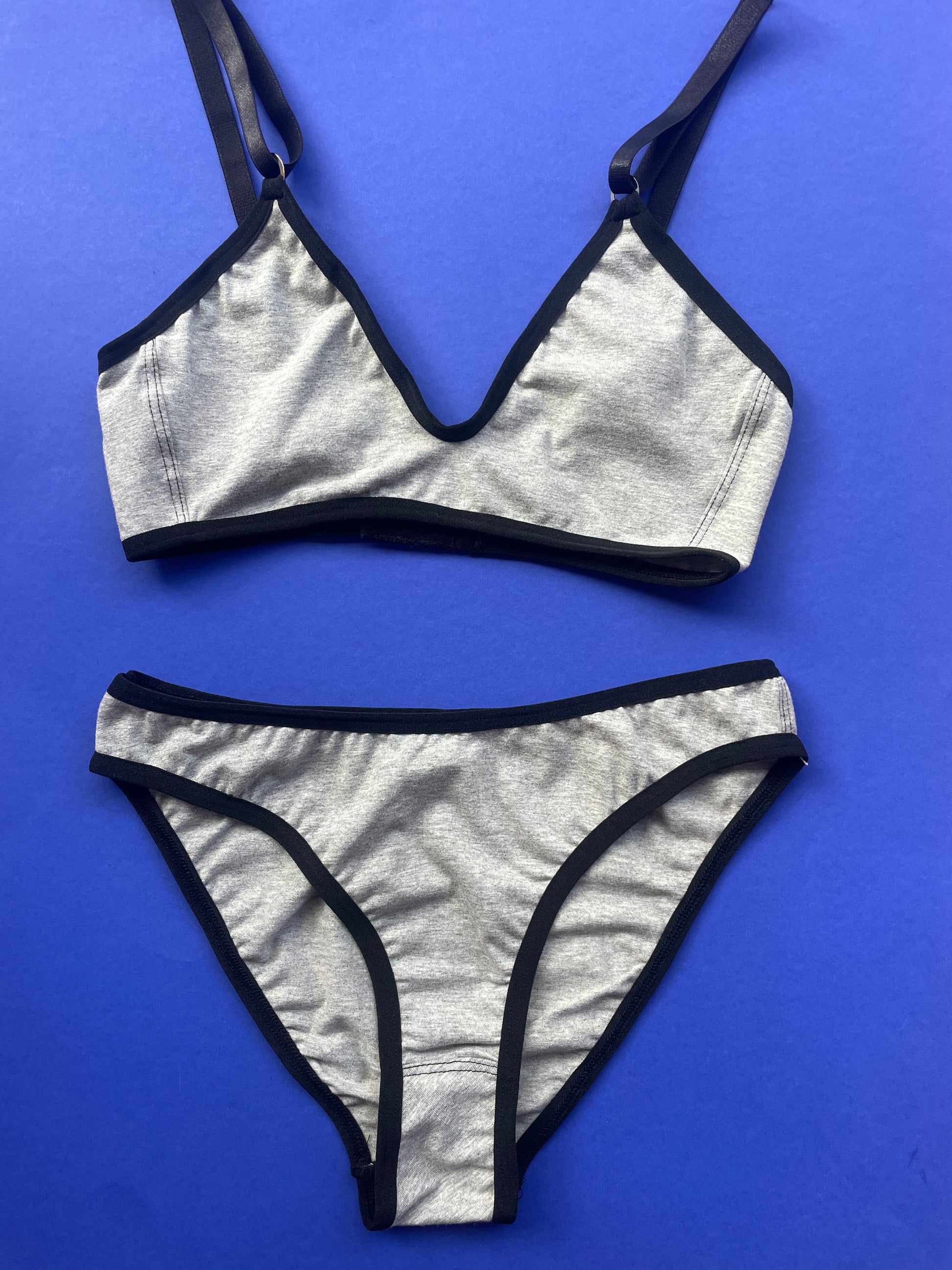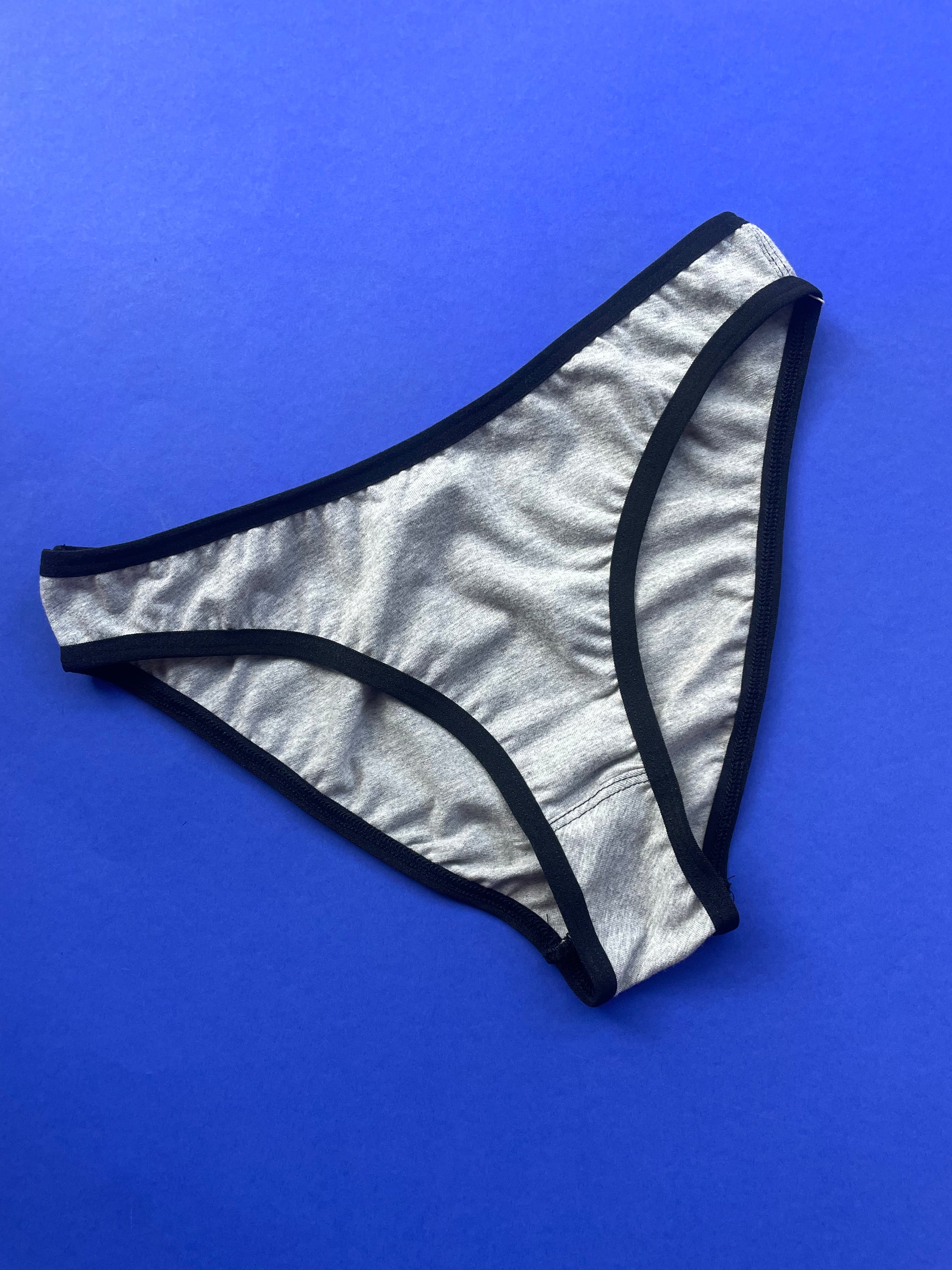 Low waisted french cut brief in comfy classic heather grey cotton with black elastic trim.