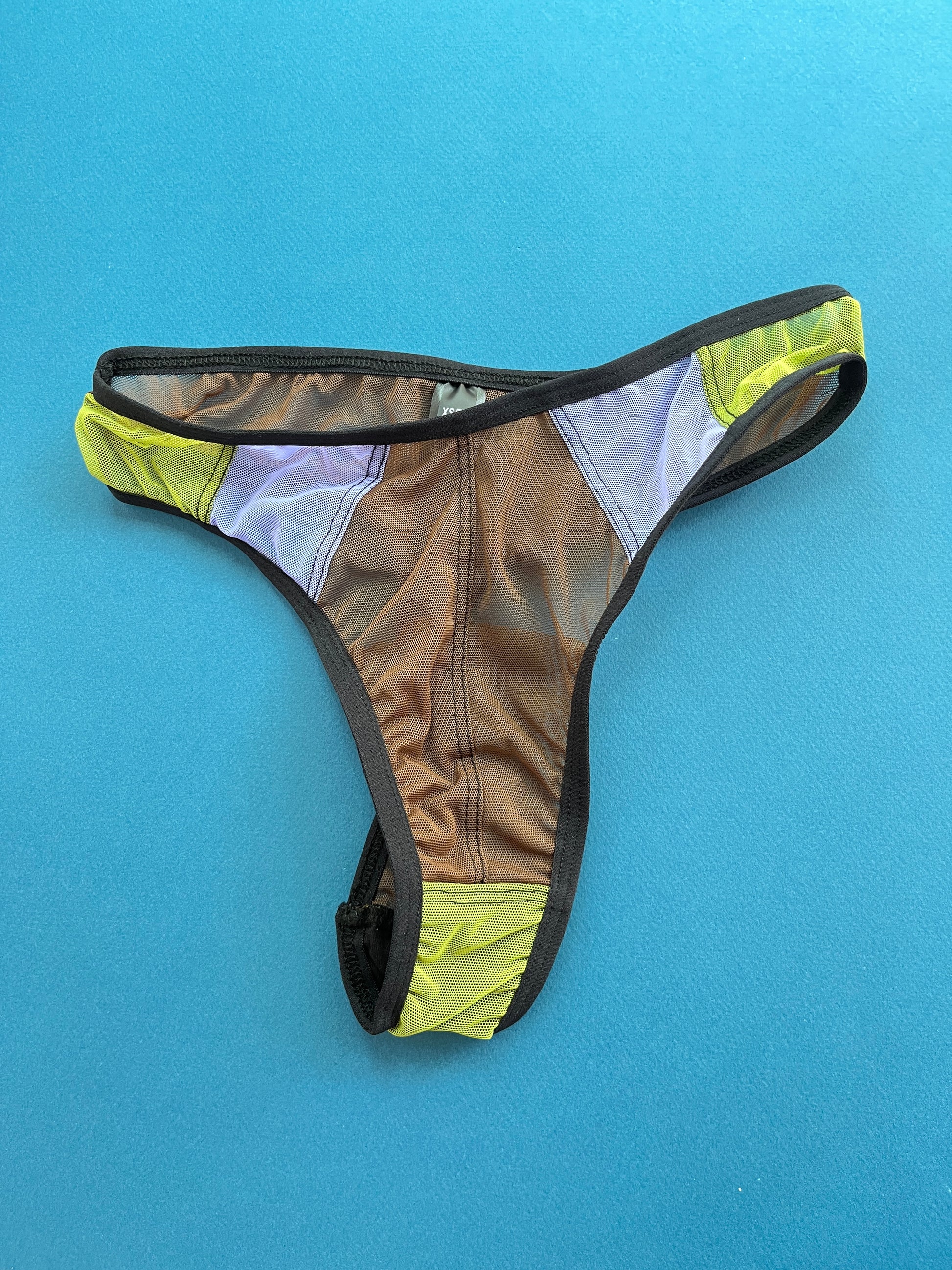 AZALEAS EXCLUSIVE! The Stevie from Bully Boy are a mid-waisted mesh thong that can match back to the best selling Brick Bra. Cotton gusset. Soft elastic trim. Fun pea green, cocoa and purple colorblock.