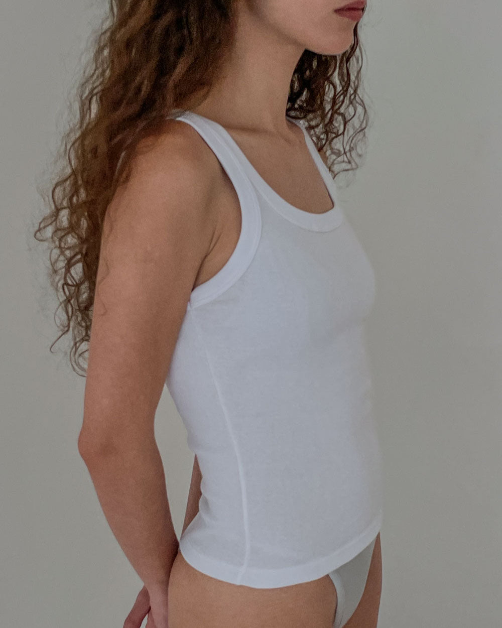 Another white tank to add to your rotation for the warmer months. Heavyweight cotton tank with thick straps and rounded neckline.  Central seam at back.