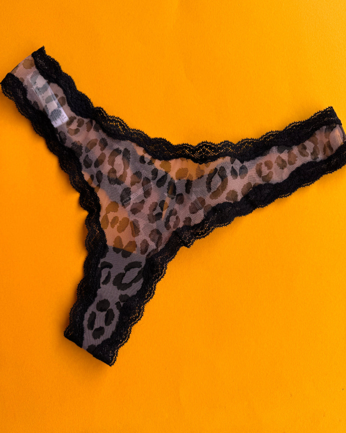 Easy, lightweight tulle thong in a flirty leopard print. Trimmed with contrasting black lace. Subtle silver ring and playful keyhole at back.