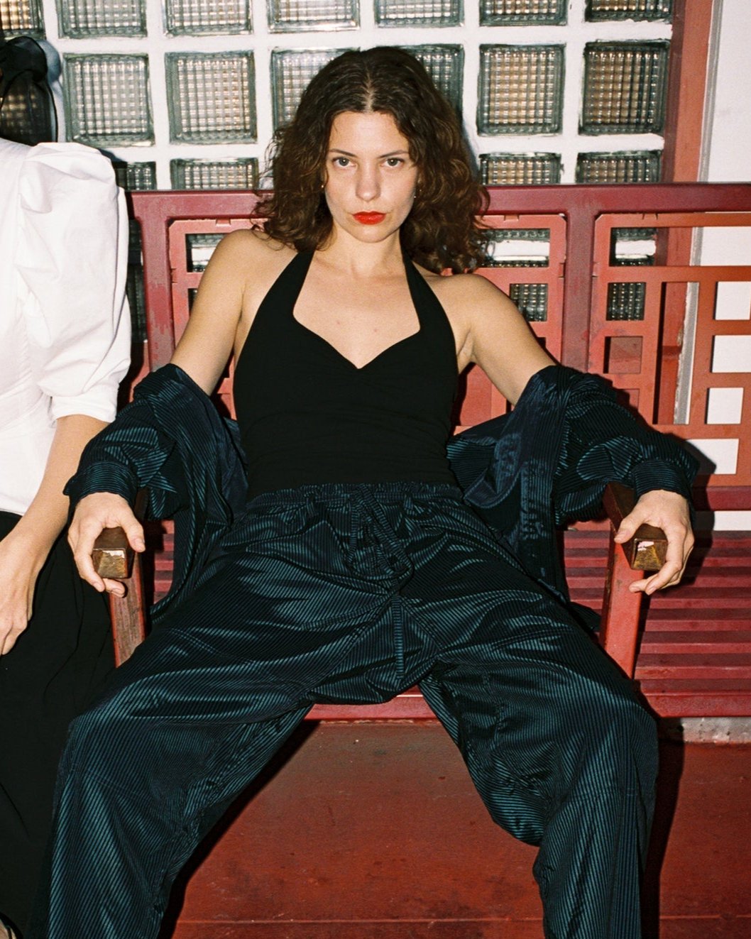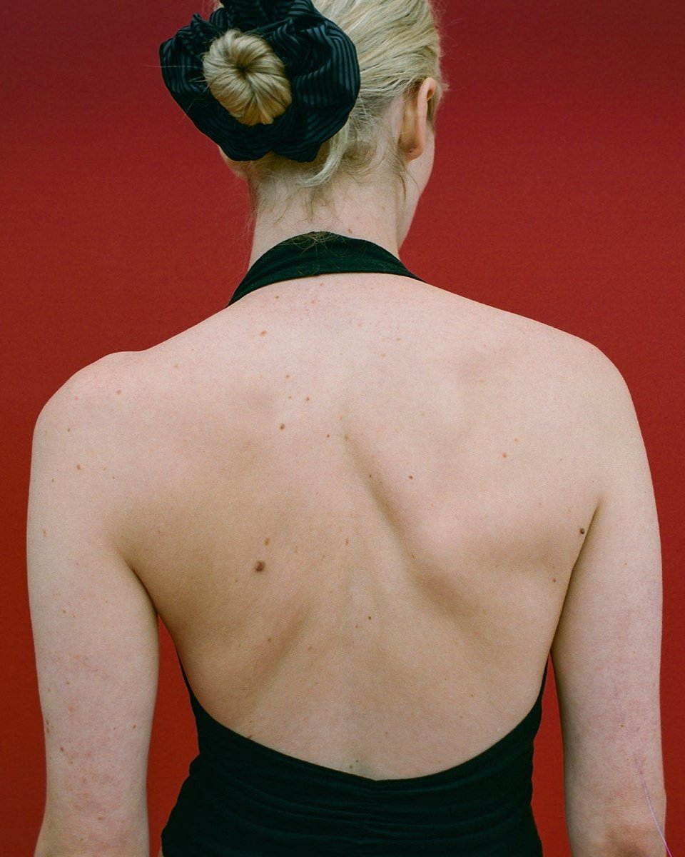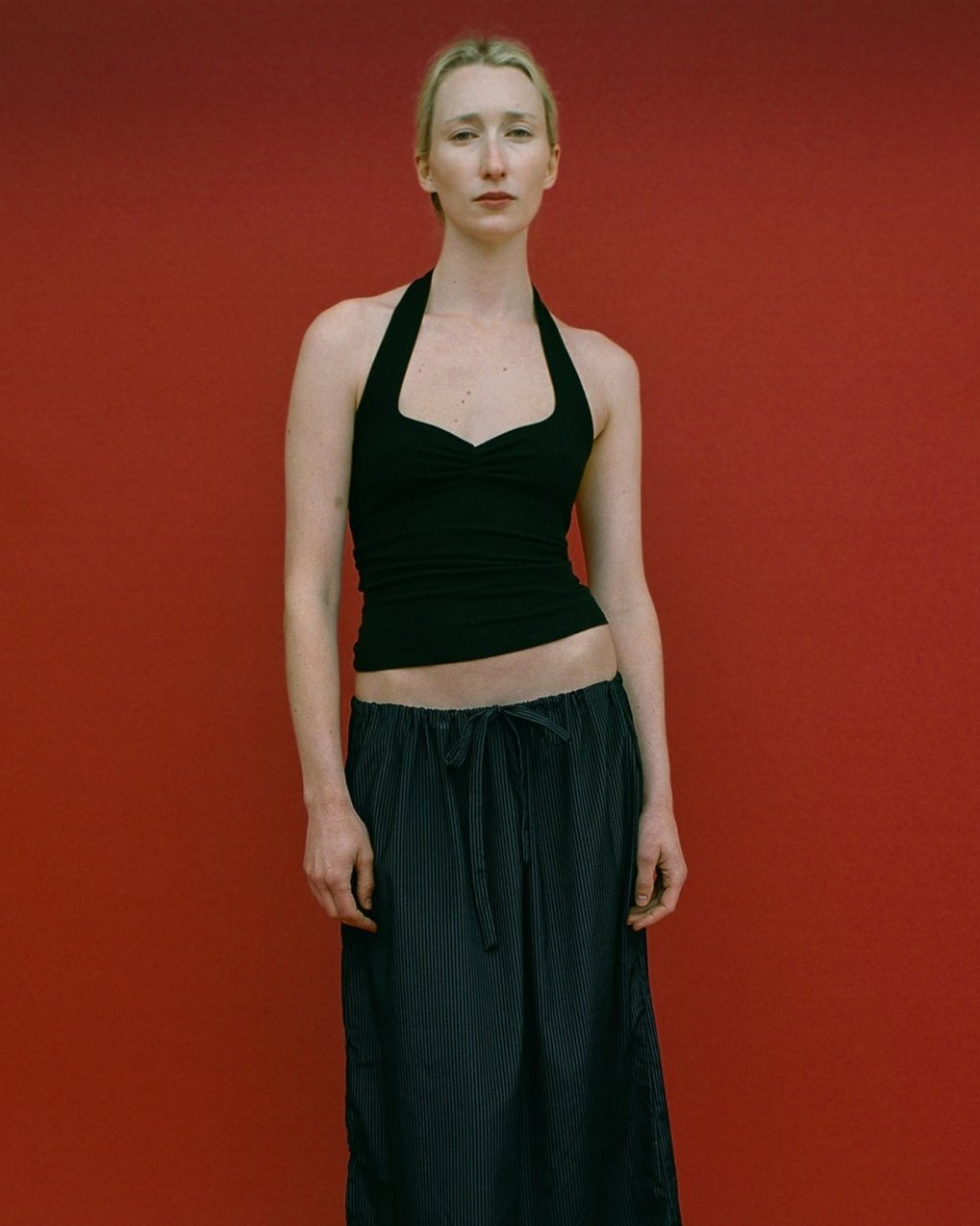 Baby's got back! Special occasion halter top with a sweetheart neckline and a plunging, ruched back detailing. Made from thick, high-end cotton spandex that's lightly brushed for a plush hand feel.