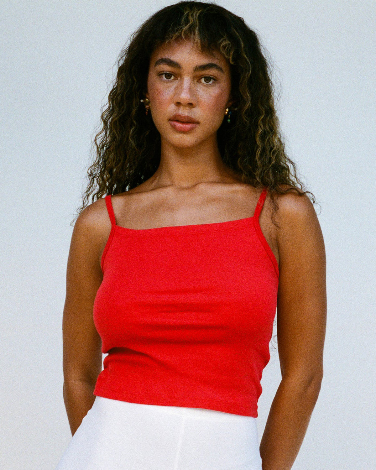 Form fitting and flattering cotton baby rib spaghetti tank with square neckline. The perfect length for the option of tucking in.