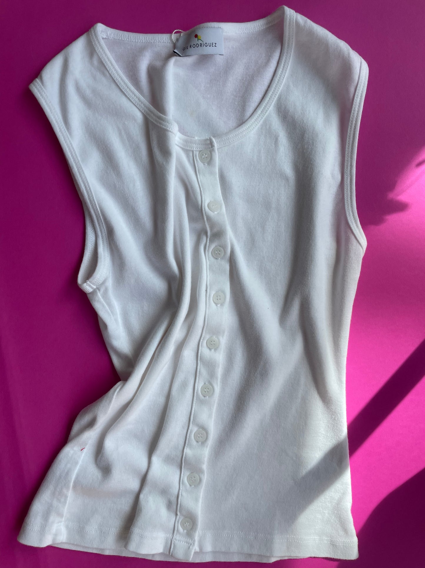 A sleeveless version of our personal fave, the Sophie cardigan. This warm-weather friendly baby rib cardigan has a button-closure and a scooped neckline. Made in Los Angeles from ultra-soft, locally-knit cotton baby rib.