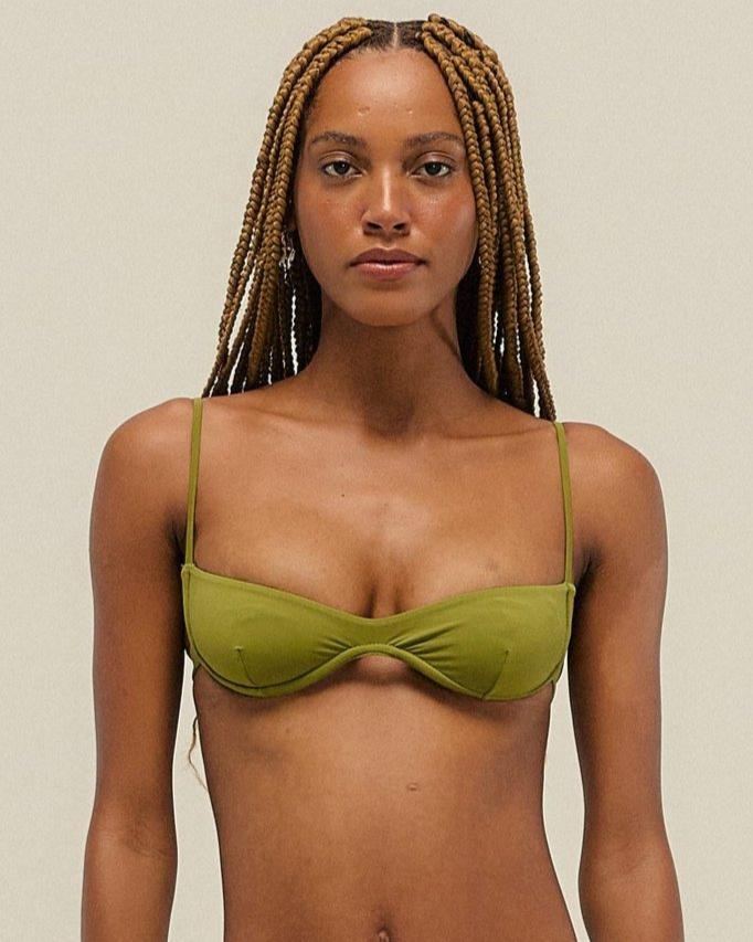 OBSESSED with this new style from Haight. Perfect for our A-B cup set customers, this monowire bikini top comes in a lush seed green color.