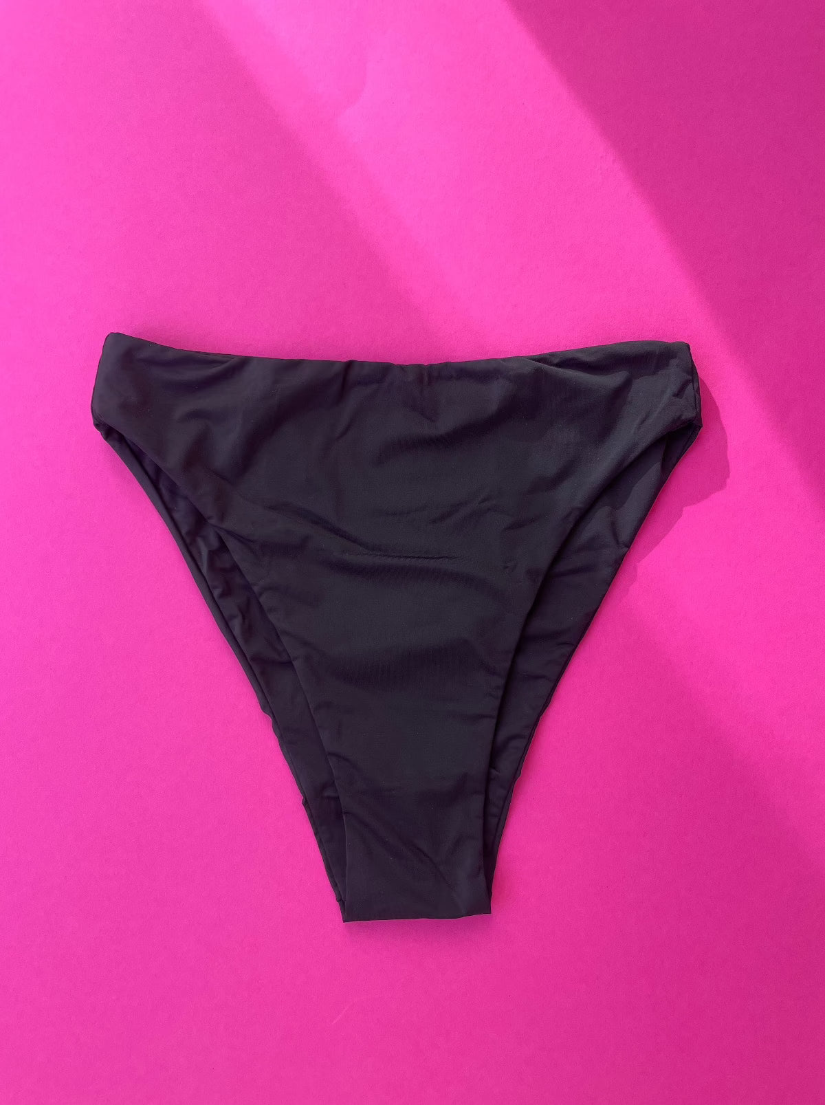 Super flattering cheeky hight waist, high-cut bikini bottoms. Elongates the legs. An essential - perfect with any black bikini top.