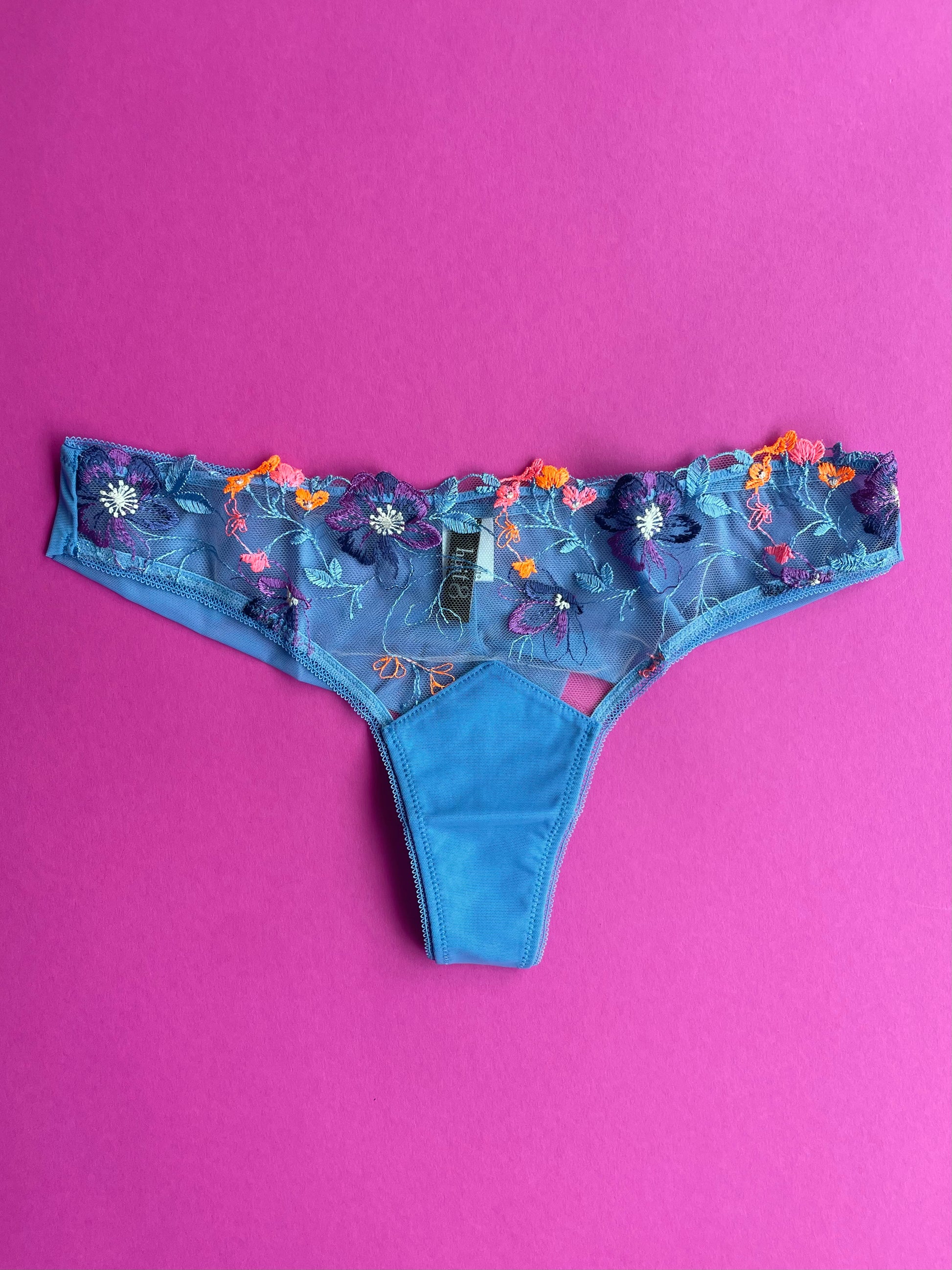 The prettiest tanga brief adorned with imported intricate floral lace embroidery on the front, featuring delicate, nature-inspired patterns brought to life in vibrant hues. Perfect for Spring and beyond.