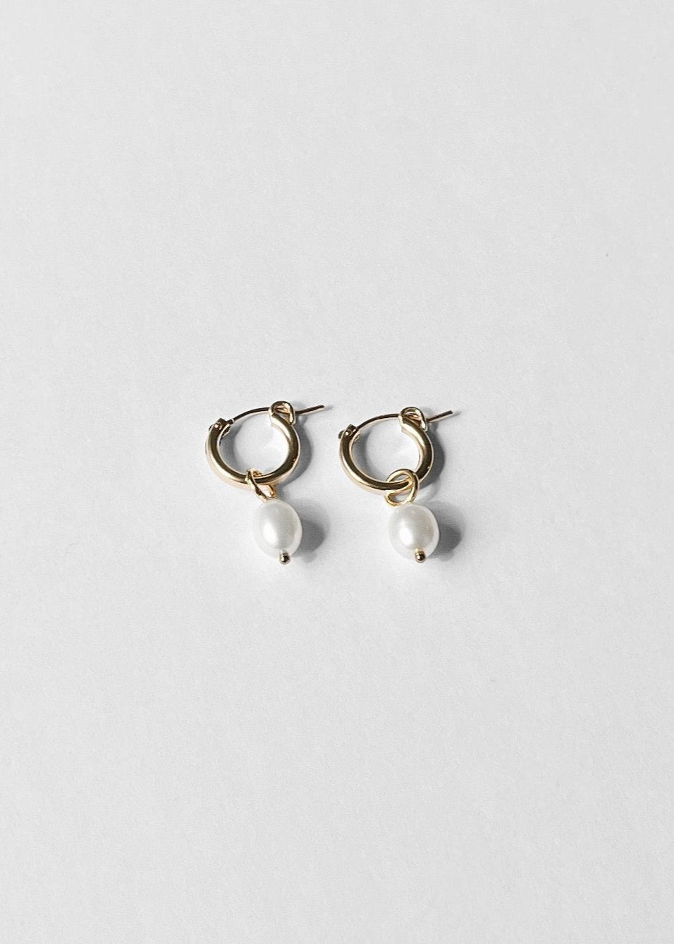 Delicate hoop earrings with interchangeable pearl drop charms. Pairs well with many outfits. Classic everyday pair.