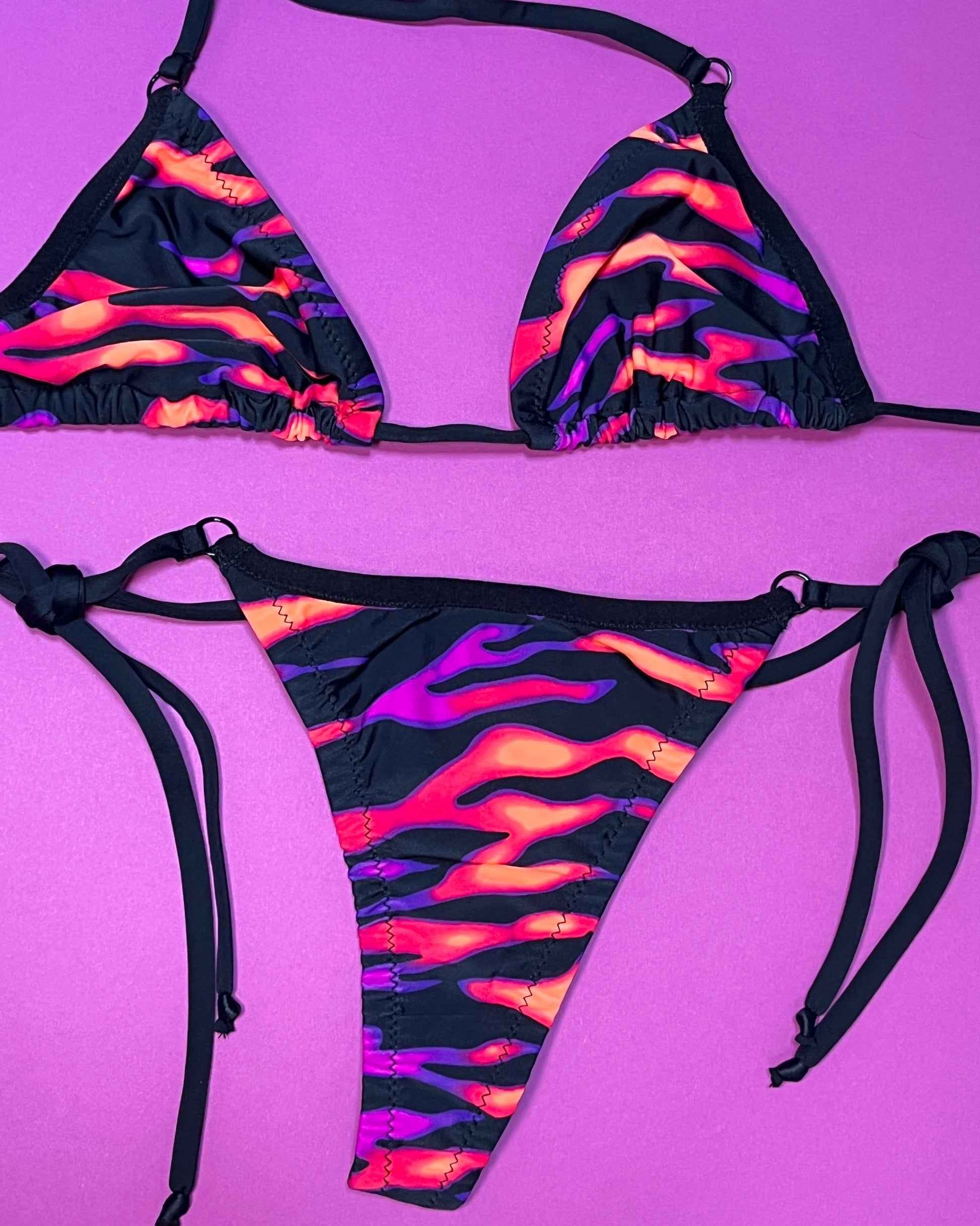 Low rise bikini bottom that ties on the side in a thong back. Vibrant neon zebra print.