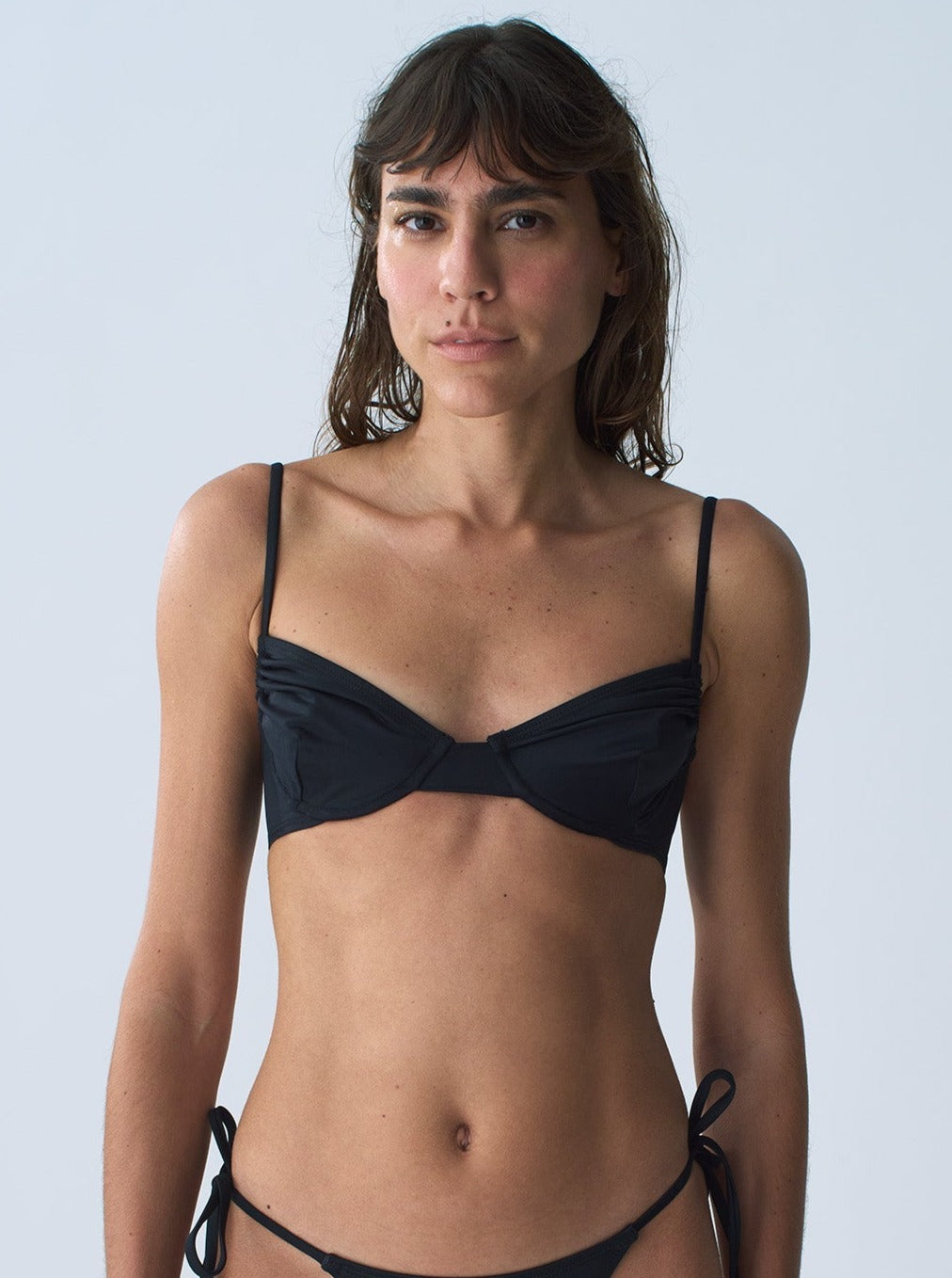 Demi-cup underwire top with adjustable shirring on the sides. This highly adjustable top is incredibly versatile and comfortable for an array of cup sizes.