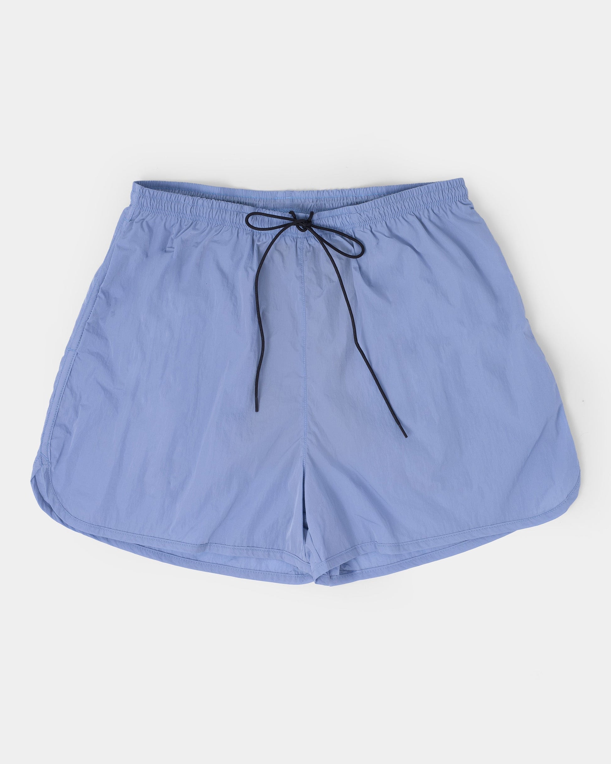 Thoughtfully constructed unisex curved hem nylon shorts perfect for water or land. Hidden side pockets and encased elastic waistband with an internal drawcord. Lined with lightweight mesh underwear.