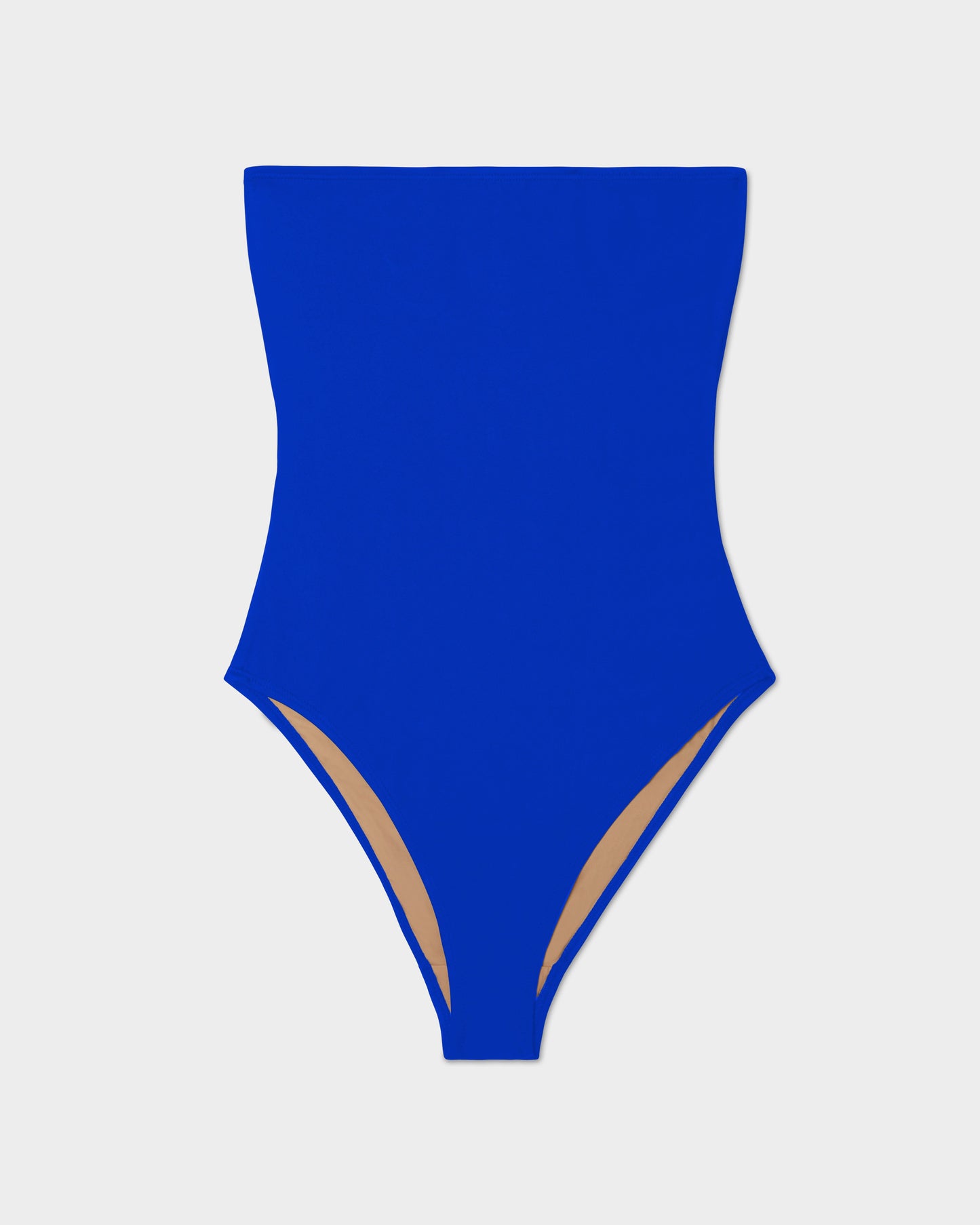 A simple strapless one piece with a high-cut leg and medium coverage across rear. Throw on a pair of easy trousers and you have a brunch outfit.
