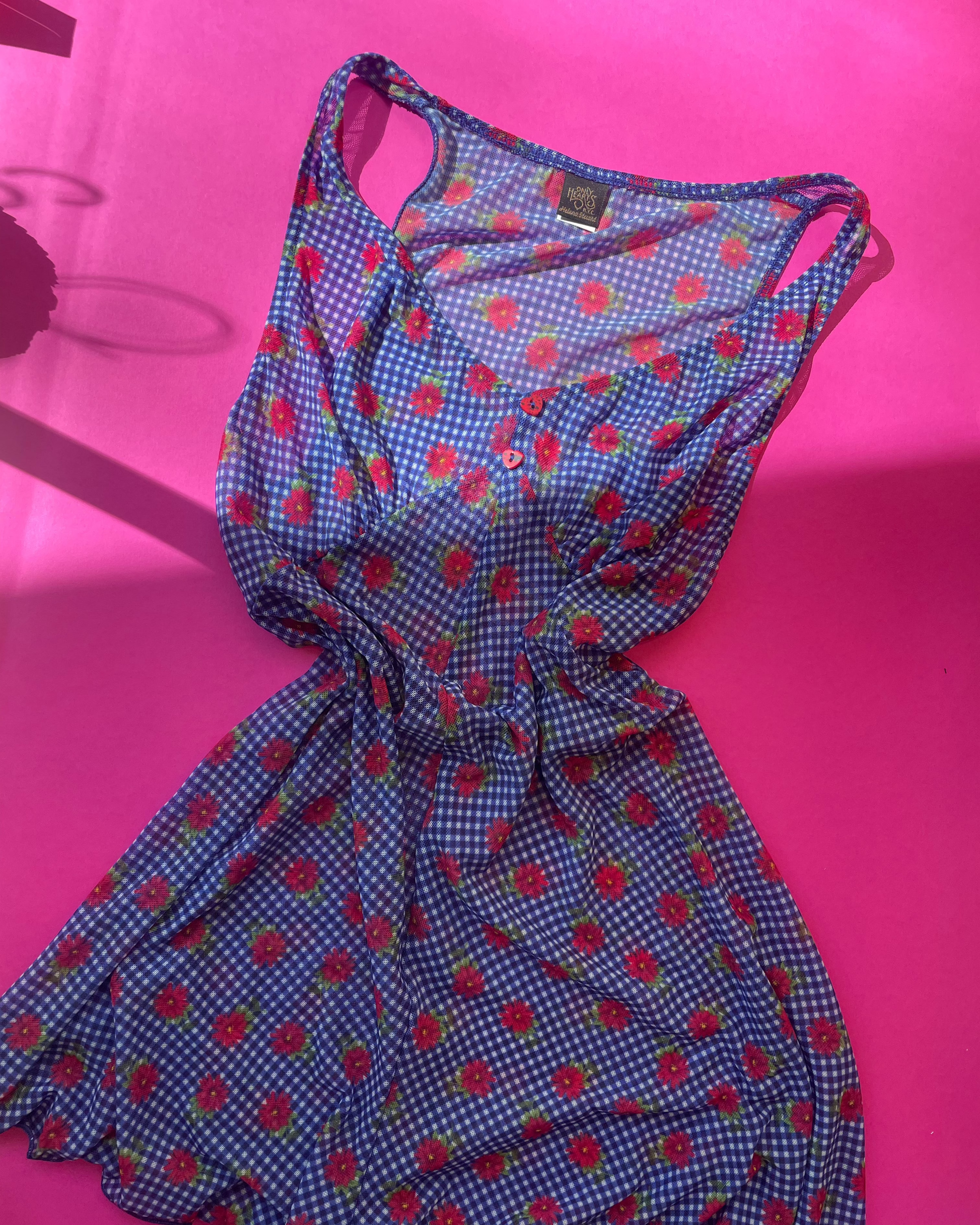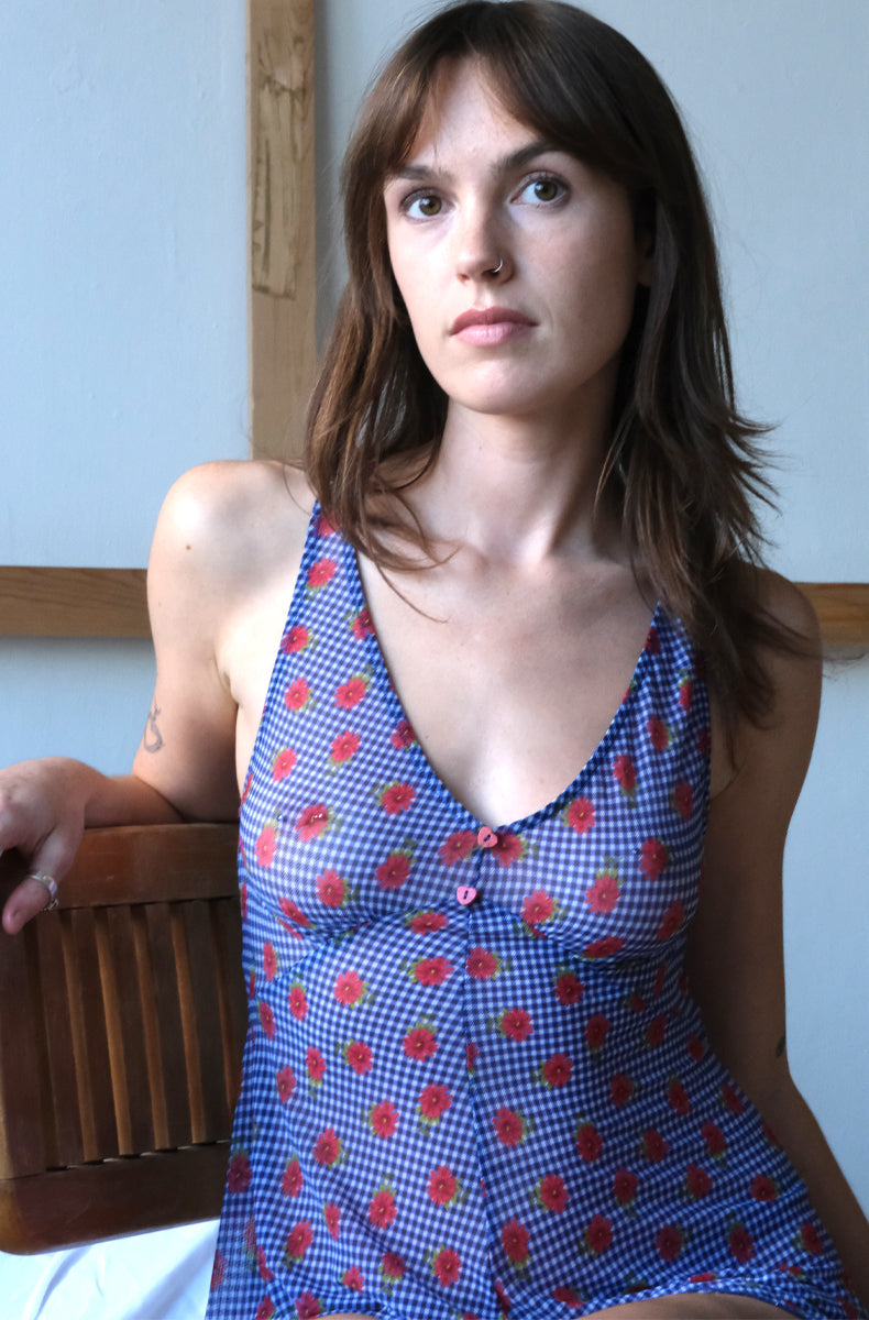Sweet little romper that borrows from early beachwear aesthetics. Scoop front with underbust seams to flatter the chest and a flowy flared short that flirtatiously grazes the bum.
