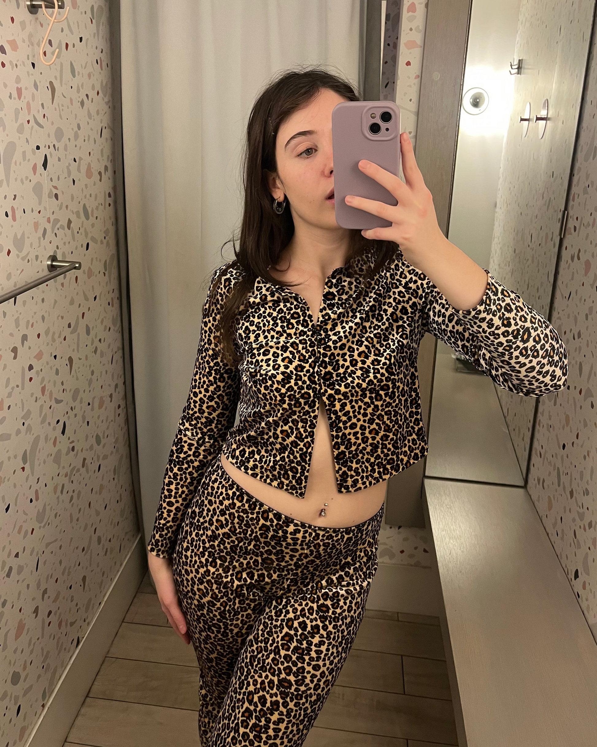 Show a little bit of your wild side while staying toasty in this classic leopard print cardigan. The velvet sheen is perfect for Fall.