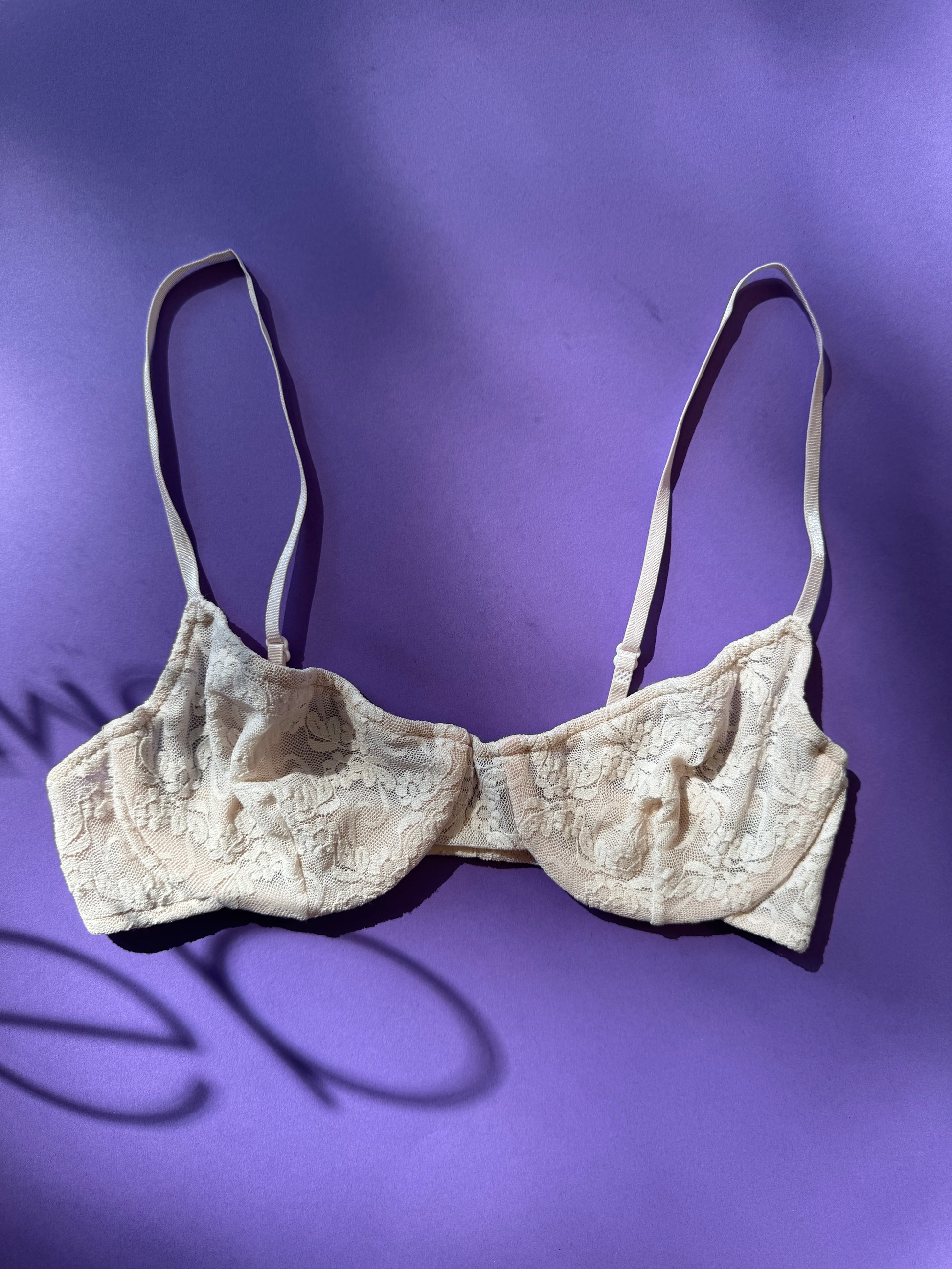 90s evoking vintage lace underwire demi bra with delicate adjustable straps, hook and eye back closure.