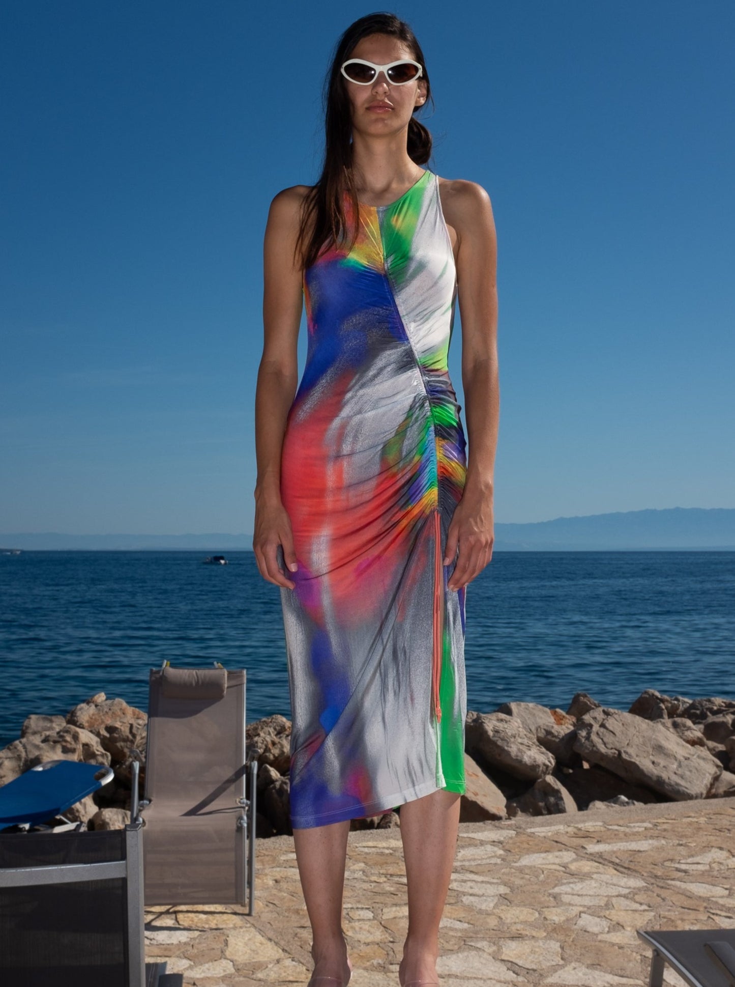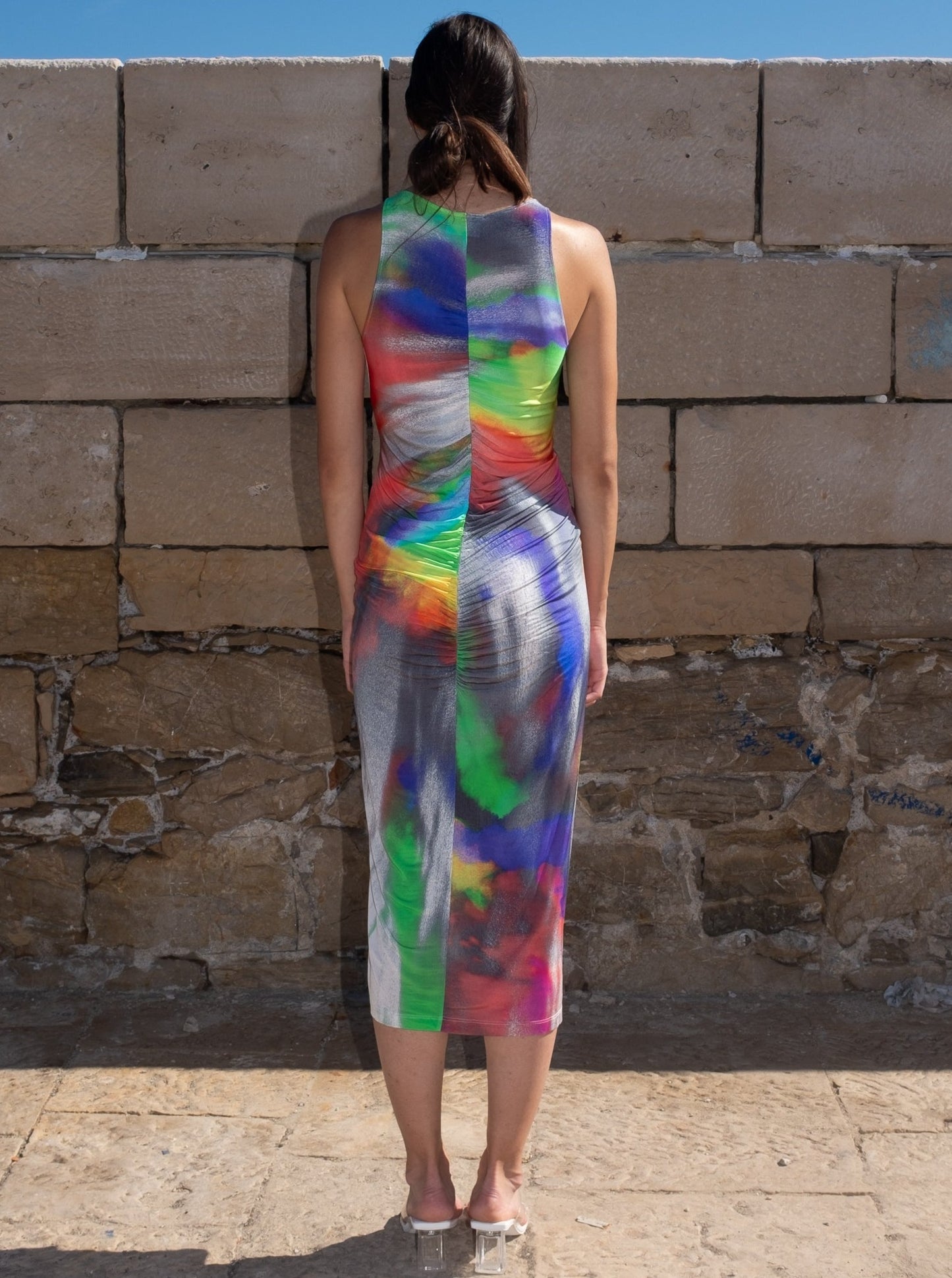 Sleeveless tank dress in a euphoric custom print. A little stretch for easy movement and molds to body. Adjustable front ruched seam detail that pulls the hem.