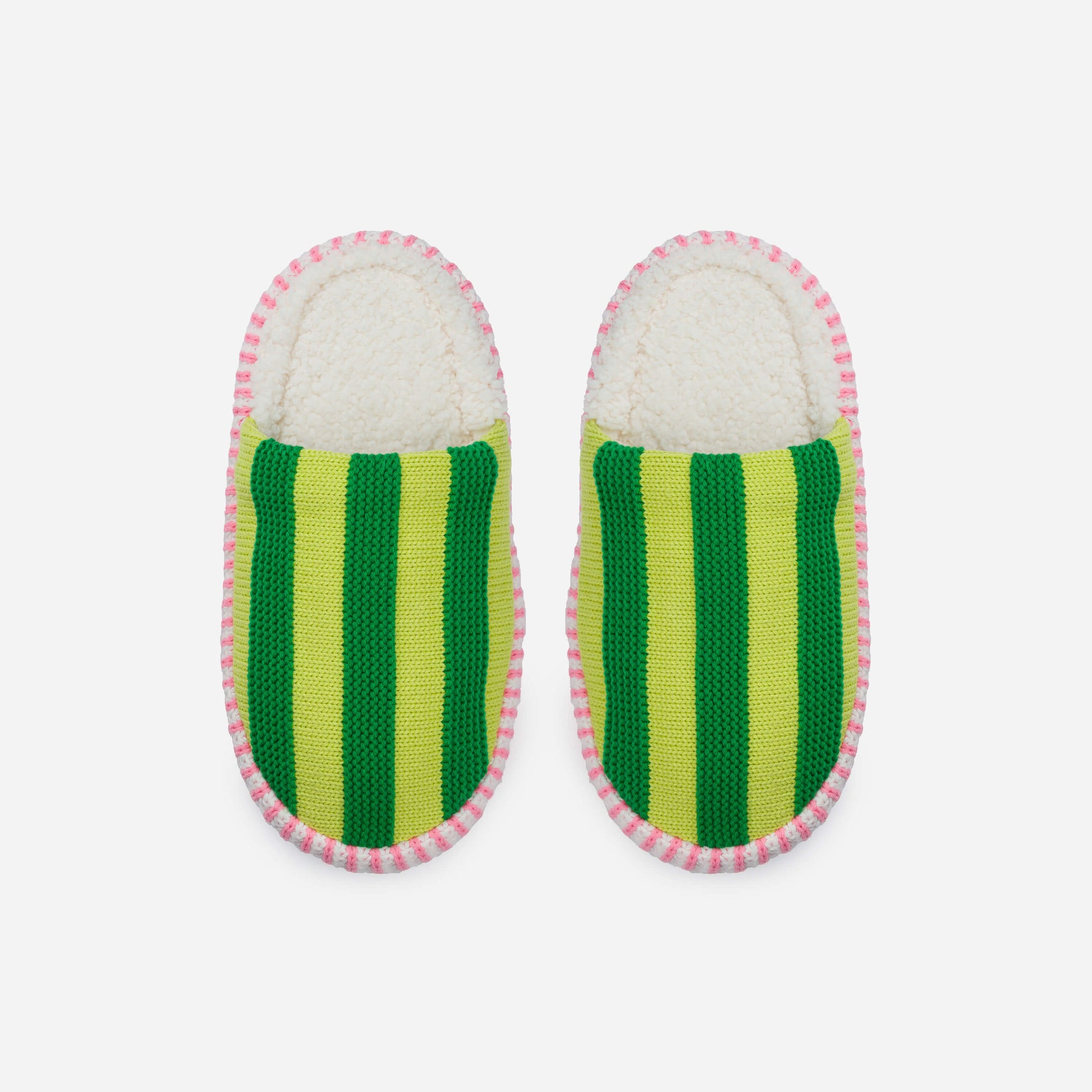 Plush spa-style slippers for the home. Eye-catching stripes!  Fully fleece-lined insides and slip-resistant padded soles. Outer edge  striped knit looks like whipstitch work.